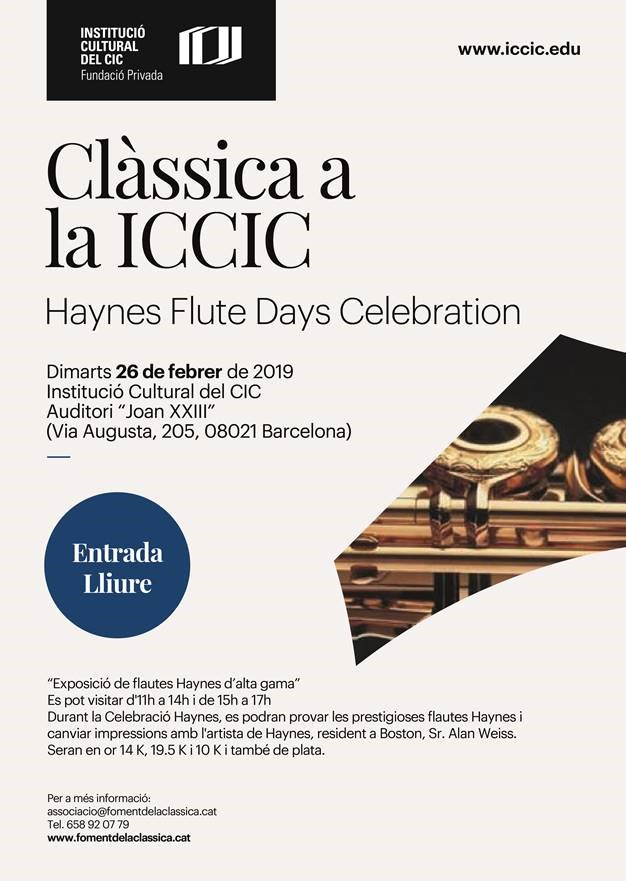 Des de la Institució Cultural del CIC ens complau convidar-los a l'exposició "Haynes Flute Days Celebration", una mostra de flautes Haynes d'alta gama.